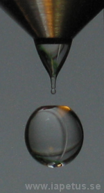 Die Tropfenabstände zeigen ein vielfältiges Verhalten mit gut beobachtbaten Zyklen der Länge 2 bis 4, Periodenverdoppelungen mit Übergang zu chaotischen Bereichen sowie sich regelmässig wiederholende Bereiche der Stabilität. Letztere werden auf Oszillationen der Form des sich ablösenden Tropfens zurückgeführt. Die Koppelung der Zeitmesselektronik mit einer Kamera hat Bilder der sich ablösenden Tropfen ermöglicht (links).
