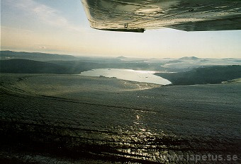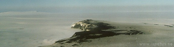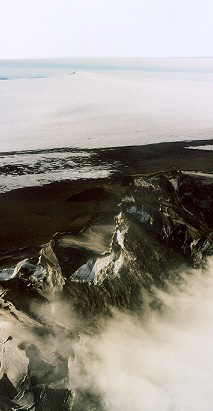 Bild 1: Überblick über die Klippe Grimsfjall; links davon liegt der Grimsvötn. Die Aufnahmen stammen von einem Überflug im Juli 1999. Die schwarze Asche auf dem Eis stammt vom letzten Ausbruch im Dezember 1998. Für Details zu diesem Ausbruch siehe NORDVULK.