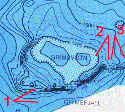 Die Karte links zeigt einen Ausschnitt von ca 10 x 8 km vom zentralen Teil des Vatnajökull. Die Ziffern mit den roten Winkeln bezeichnen die Blickwinkel der Aufnahmen weiter unten im Text. Mit einem Kreuz ist die Ausbruchsstelle vom 1998 markiert (64°24.06’ N, 17°20.19’ W).