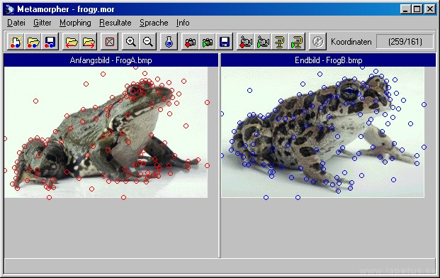 This program calculates smooth transitions between two images. The morphing sequence can be saved as single pictures or as movie in AVI format. In the two reference images fixpoints are defined that indicate corresponding image parts to produce a smooth morph. A highcolor or true color display is recommended for best results.